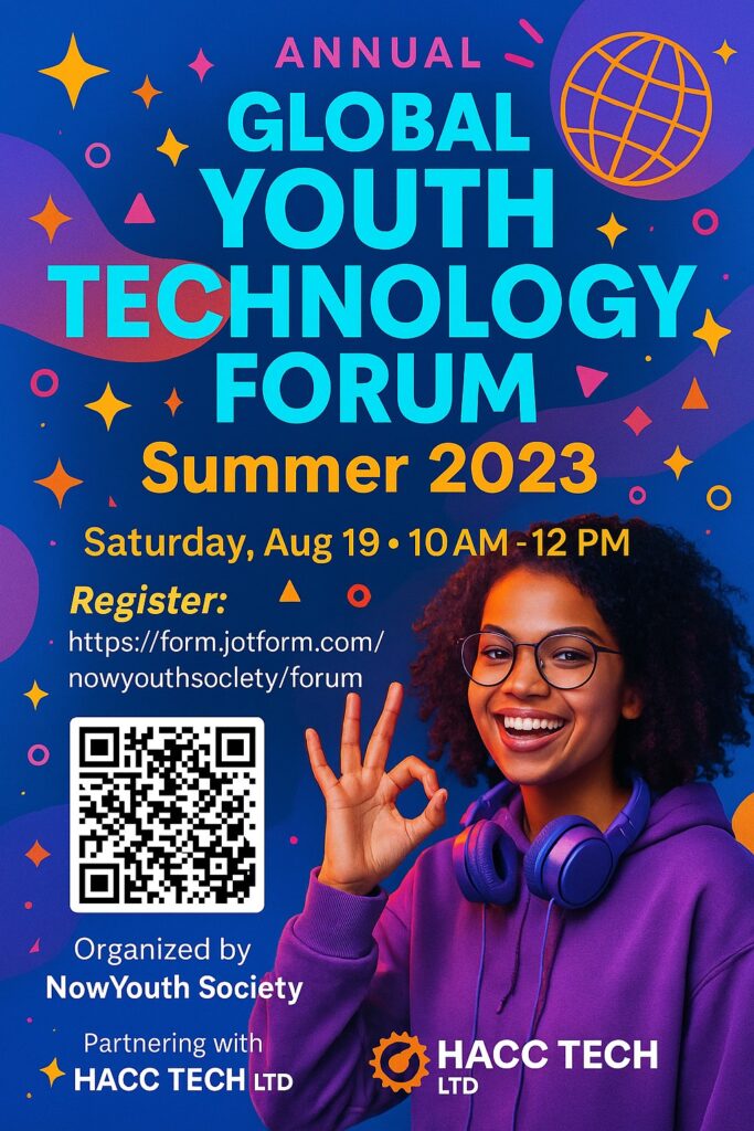 The Global Youth Technology Forum 2023, organized by NowYouth Society in partnership with HACC TECH Ltd, is an international online gathering designed to connect, inspire, and empower the next generation of young technologists, innovators, and creators. Taking place on Saturday, August 19, 2023, from 10 AM to 12 PM, this exciting virtual forum brings together youth from around the world who share a common passion for technology, innovation, and positive global change.