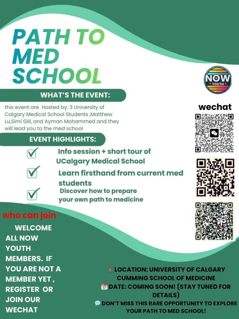 Join us for an inspiring and interactive evening with NowYouth leaders and UCalgary Cumming School of Medicine students โ Matthew Lu, Simi Gill, and Ayman Mohammed โ who will share their experiences and tips for your own journey to medicine!